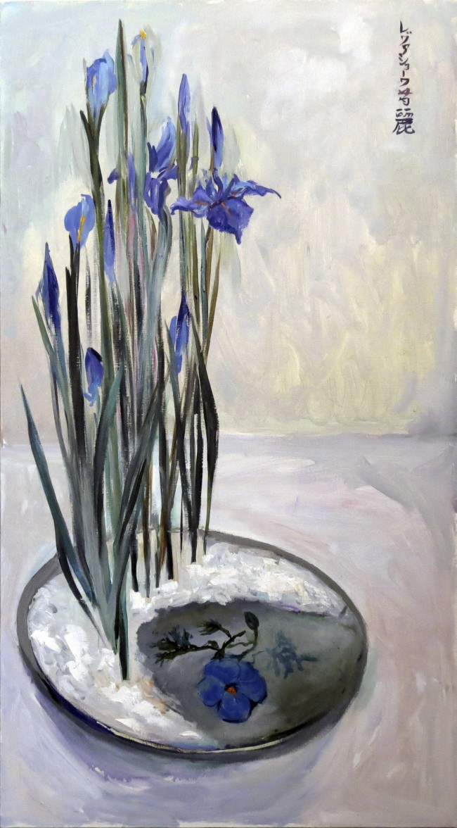 «Ирисы. Цветочная композиция «Дзюка»», холст, масло, 49х88, 2014 г.